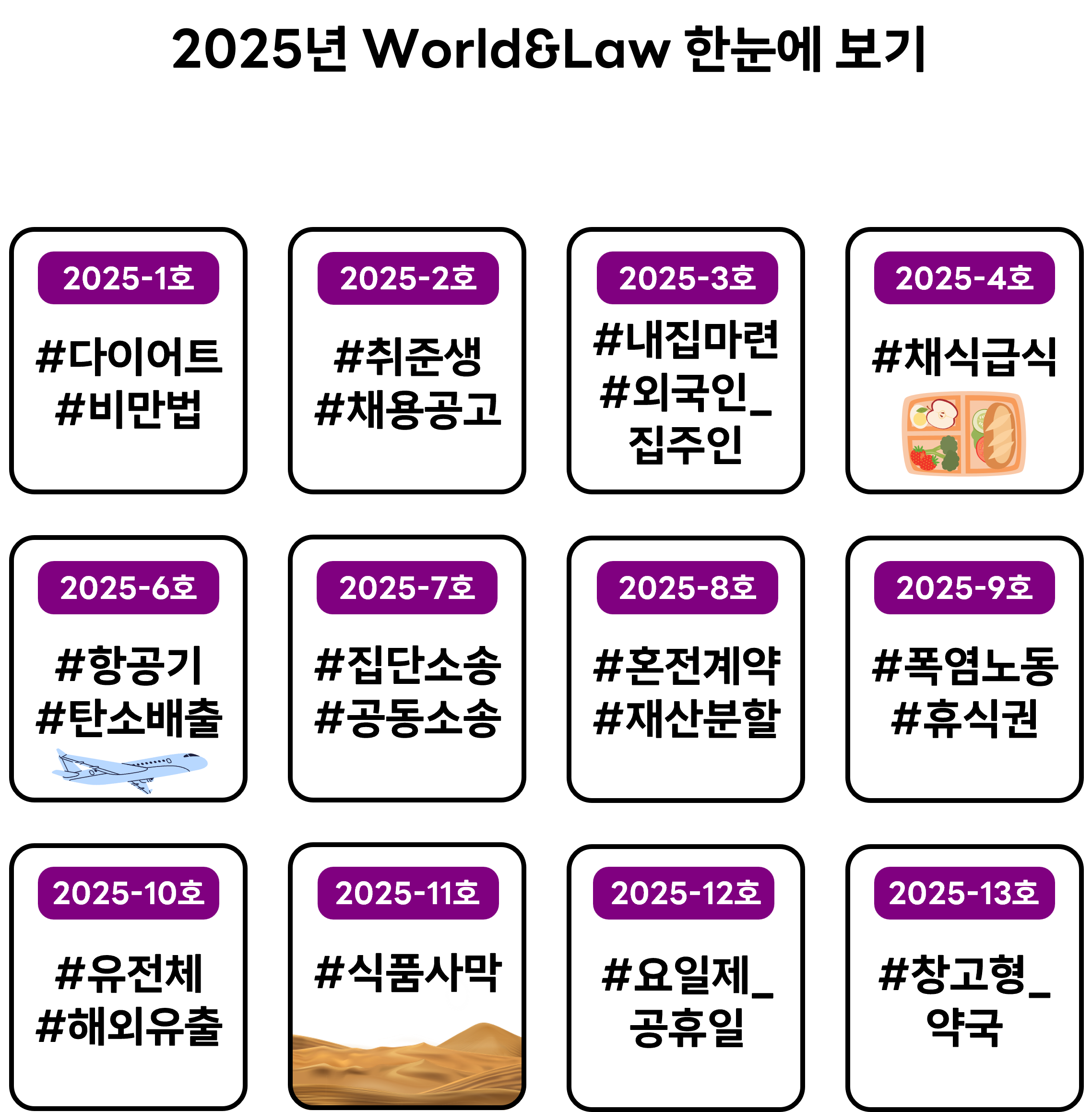 어느덧 2025년이 2주가 채 남지 않았어요. 올 한 해 어떠셨나요? 올해도 World&Law는 세계 곳곳에서 일어나는 흥미로운 법 이야기를 여러분께 전해드렸는데요. 세계 각국이 비슷한 문제를 얼마나 다양한 방식으로 풀어가는지 함께 살펴보며, 우리 사회를 한 걸음 물러서서 바라보는 시간이었던 것 같아요. 올해 World&Law가 다뤘던 주제들을 지금부터 함께 되돌아볼까요? |